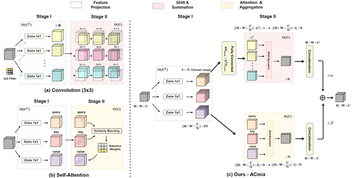 Convolution and self-attention are two powerful techniques for representation learning, and they are usually considered as two peer approaches that are distinct from each other. In this paper, we show that there exists a strong underlying relation between them, in the sense that the bulk of computations of these two paradigms are in fact done with the same operation. Specifically, we first show that a traditional convolution with kernel size k x k can be decomposed into k^2 individual 1 x 1 convolutions, followed by shift and summation operations. Then, we interpret the projections of queries, keys, and values in self-attention module as multiple 1 x 1 convolutions, followed by the computation of attention weights and aggregation of the values. Therefore, the first stage of both two modules comprises the similar operation. More importantly, the first stage contributes a dominant computation complexity (square of the channel size) comparing to the second stage. This observation naturally leads to an elegant integration of these two seemingly distinct paradigms, i.e., a mixed model that enjoys the benefit of both self-Attention and Convolution (ACmix), while having minimum computational overhead compared to the pure convolution or self-attention counterpart. Extensive experiments show that our model achieves consistently improved results over competitive baselines on image recognition and downstream tasks. Code and pre-trained models will be released at https://github.com/LeapLabTHU/ACmix and https://gitee.com/mindspore/models.