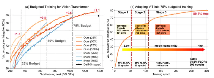The superior performances of Vision Transformers often come with higher training costs. Compared to their CNN counterpart, Transformer models are hungry for large-scale data and their training schedules are usually prolonged. This sets great restrictions on training Transformers with limited resources, where a proper trade-off between training cost and model performance is longed. In this paper, we address the problem by proposing a framework that enables the training process under any training budget from the perspective of model structure, while achieving competitive model performances. Specifically, based on the observation that Transformer exhibits different levels of model redundancies at different training stages, we propose to dynamically control the activation rate of the model structure along the training process and meet the demand on the training budget by adjusting the duration on each level of model complexity. Extensive experiments demonstrate that our framework is applicable to various Vision Transformers, and achieves competitive performances on a wide range of training budgets.
